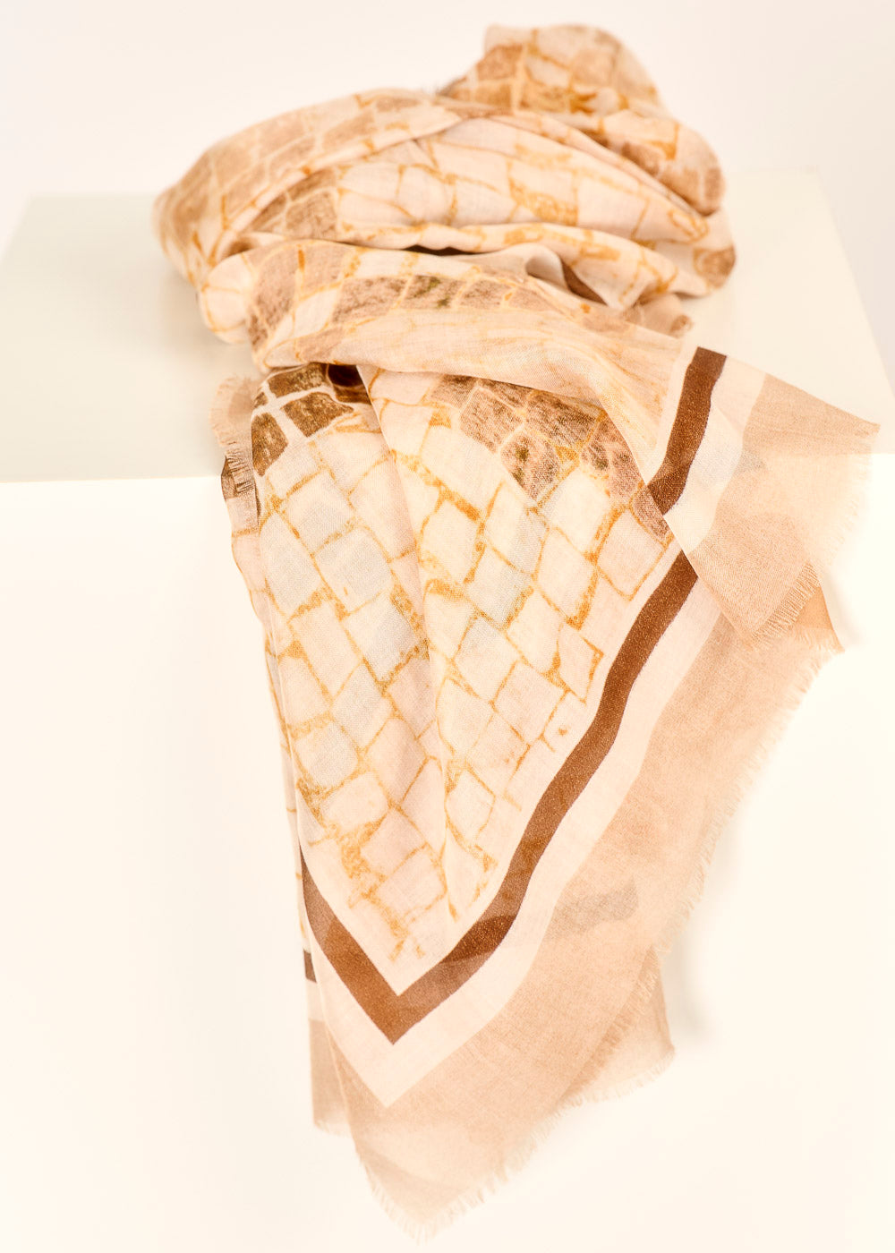 Dieses stilvolle Tuch mit seinem einzigartigen Mosaik-Muster in warmen Erdtönen ist ein wahrer Blickfang und verleiht jedem Outfit eine künstlerische Note. Das leichte Material schmiegt sich sanft an und ist der perfekte Begleiter für kühle Abende oder um Ihren Look gekonnt abzurunden. Dank seines zeitlosen Designs lässt es sich vielseitig kombinieren und wird schnell zu einem Ihrer Lieblingsaccessoires.