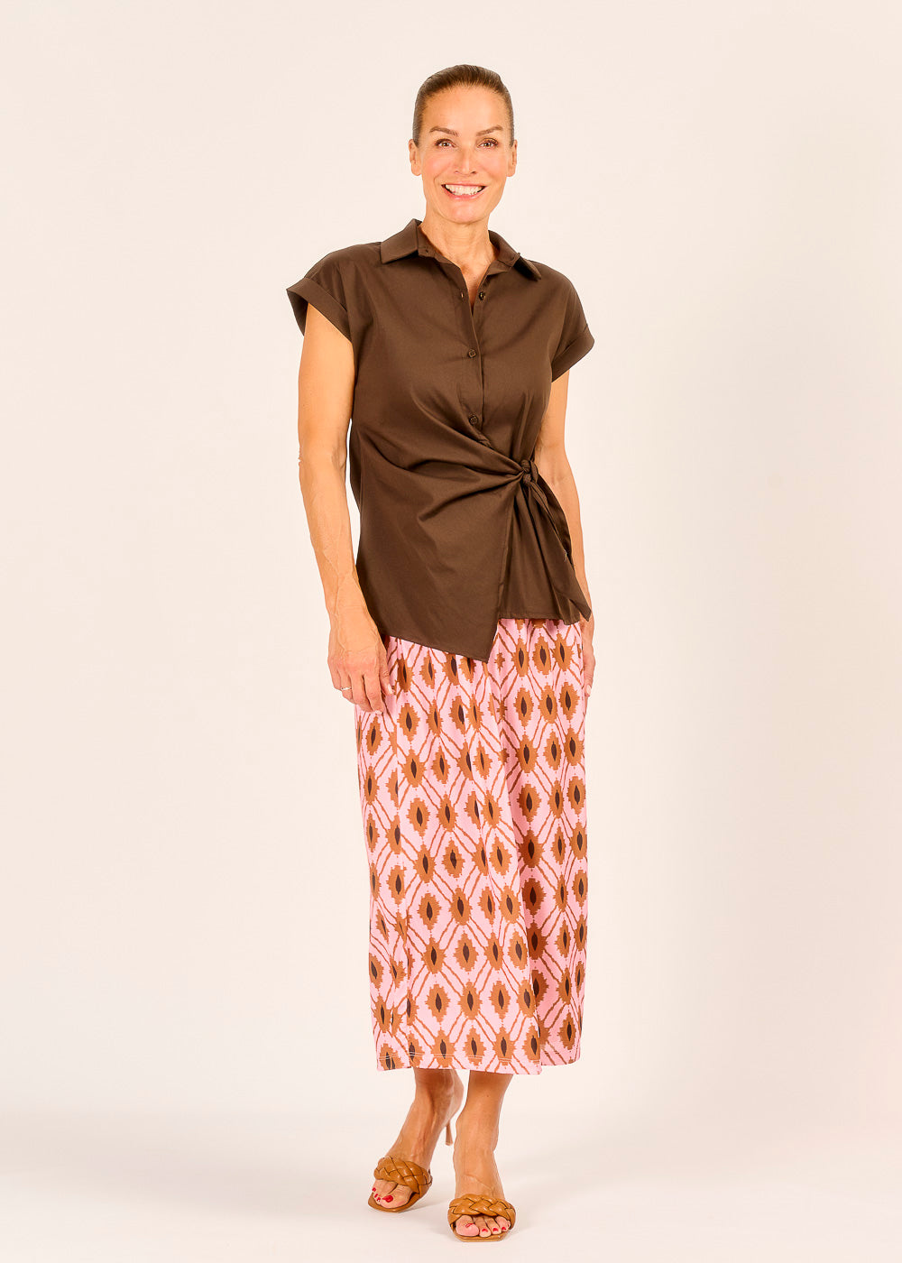 Diese Wickelbluse in der warmen Farbe Moka ist ein vielseitiges Essential für Ihre Garderobe. Ihr schmeichelhafter Wickelschnitt betont die Taille und sorgt für eine elegante Silhouette, die sich jedem Anlass anpasst. Tragen Sie sie lässig zur Jeans oder elegant zum Rock – diese Bluse verleiht jedem Outfit eine besondere Note.