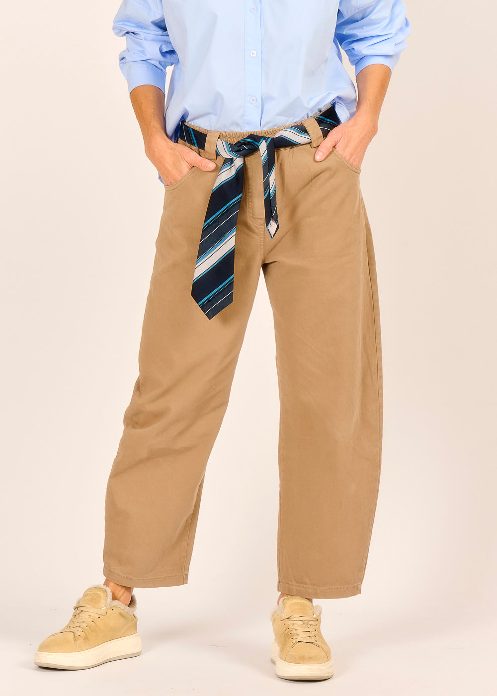 Diese lässige Chino besticht durch ihren entspannten Schnitt und das angenehme Material, das sie zum idealen Begleiter für moderne Alltagslooks macht. Der wahre Clou ist jedoch der originelle Gürtel: Eine Krawatte dient hier als stylischer Akzent und verleiht der Hose eine einzigartige, raffinierte Note. So wird aus einem Klassiker ein echtes Fashion-Statement, das spielerisch Eleganz und Lässigkeit miteinander verbindet.