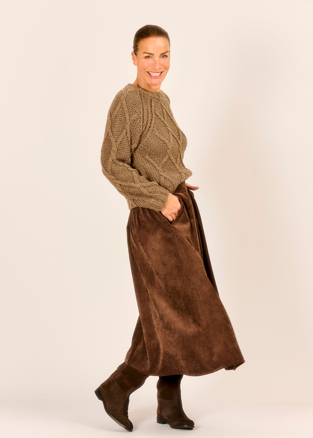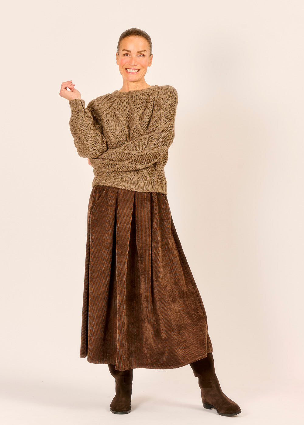 Dieser elegante Maxirock aus weichem Cord in sattem Moka (Dunkelbraun) vereint Stil und Tragekomfort dank der raffinierten Passe vorne und einem bequemen Gummizug hinten. Die modischen, weiten Falten verleihen dem Rock eine feminine Weite und Eleganz, während die praktischen seitlichen Eingriffstaschen Lässigkeit in das Design bringen. Ein wunderbares Key-Piece, das besonders im Herbst und Winter mit Stiefeln und Strickpullovern stilvolle Textur-Akzente setzt.