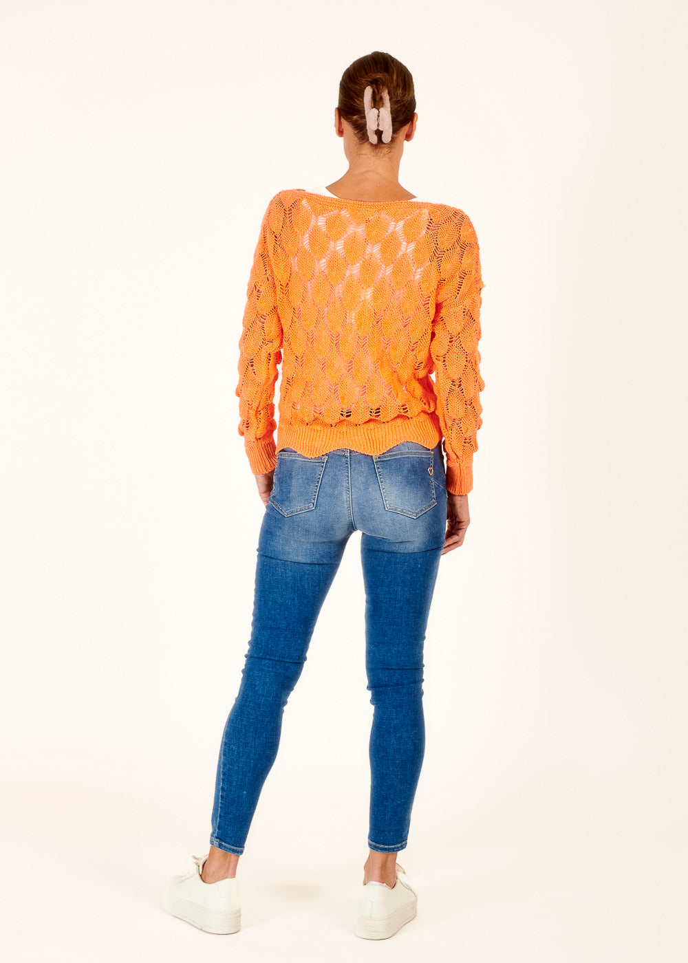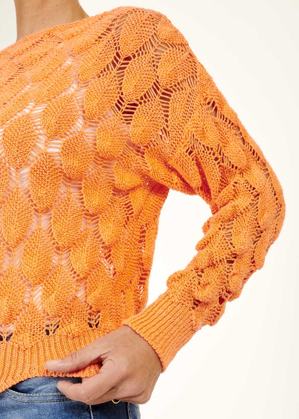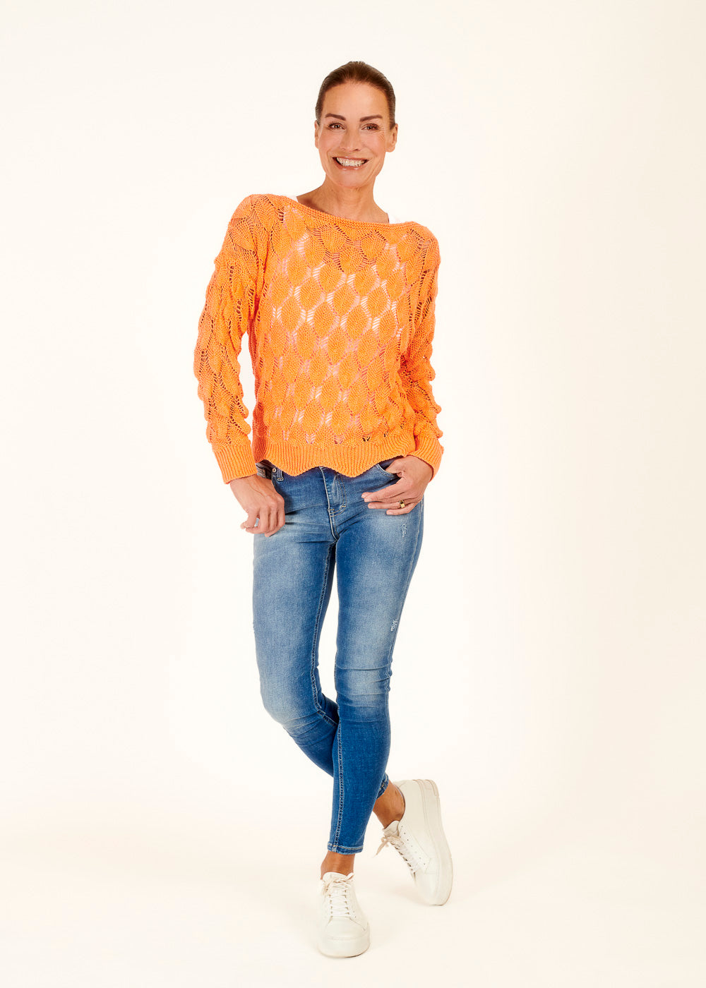 Tauche ein in die Welt des raffinierten Stils mit unserem bezaubernden Ajour-Pullover in lebendigem Orange.