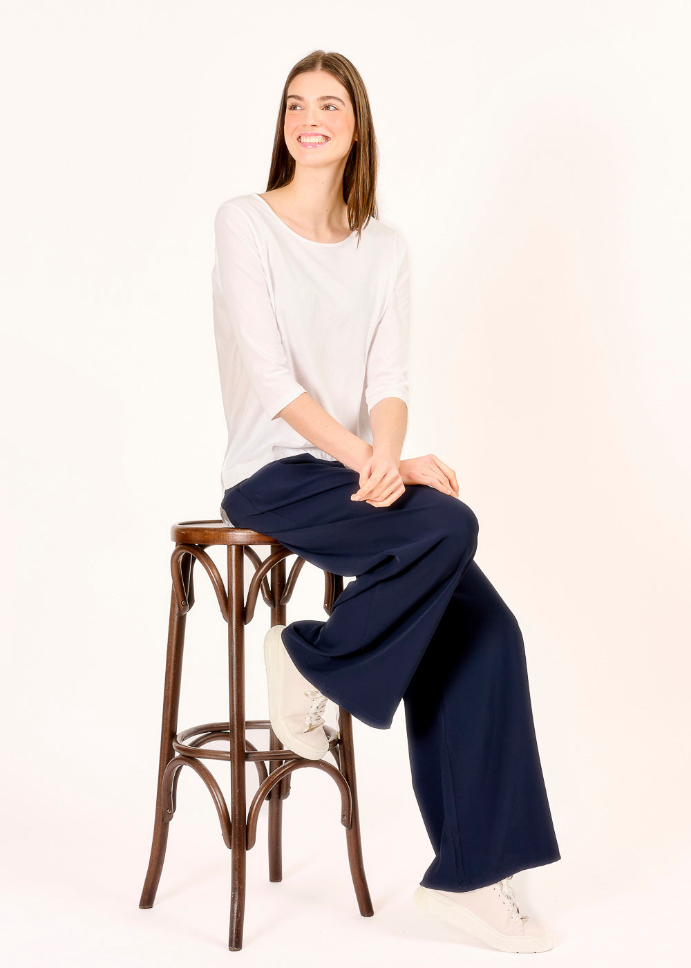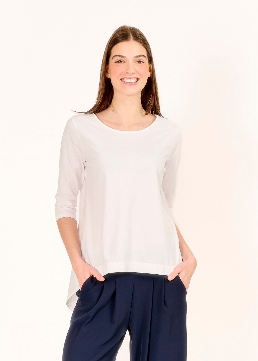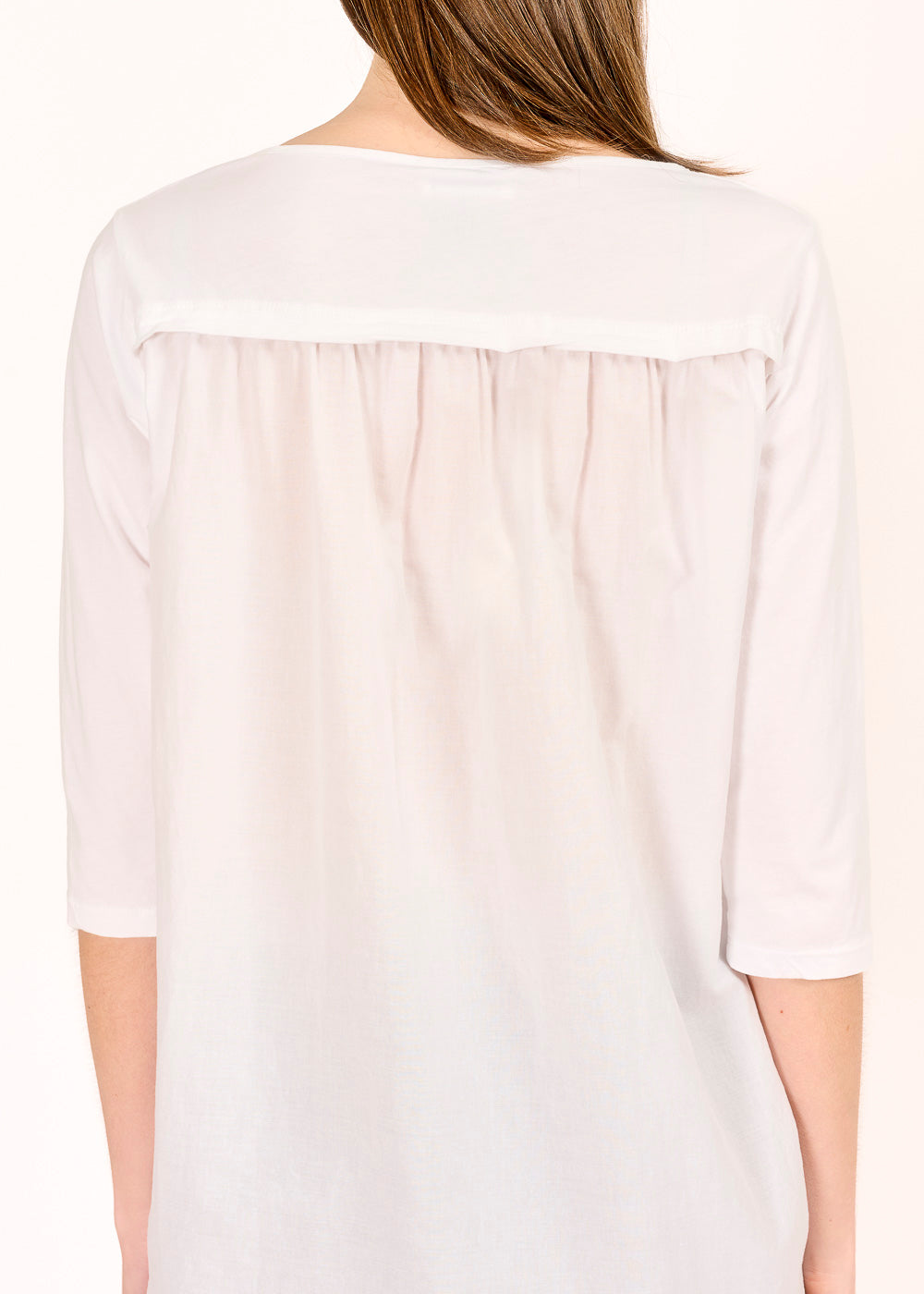 Ein Shirt, das deinen Look auf ein neues Level hebt: unser neues Materialmix-Shirt mit 3/4-Arm in strahlendem Weiß! Mit einem einzigartigen Materialmix aus hochwertigen Stoffen ist dieses Shirt nicht nur ein Basic, sondern ein echtes Statement-Piece. Der runde Halsausschnitt verleiht ihm eine zeitlose Eleganz und die subtilen Raffungen auf der Rückseite sorgen für einen Hauch von Raffinesse. Ein absolutes Must-Have!