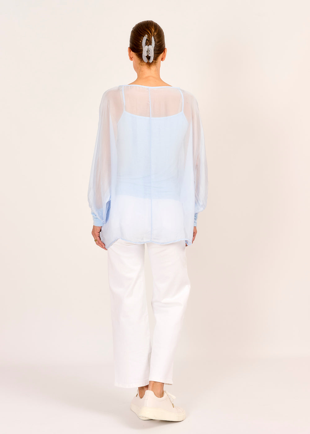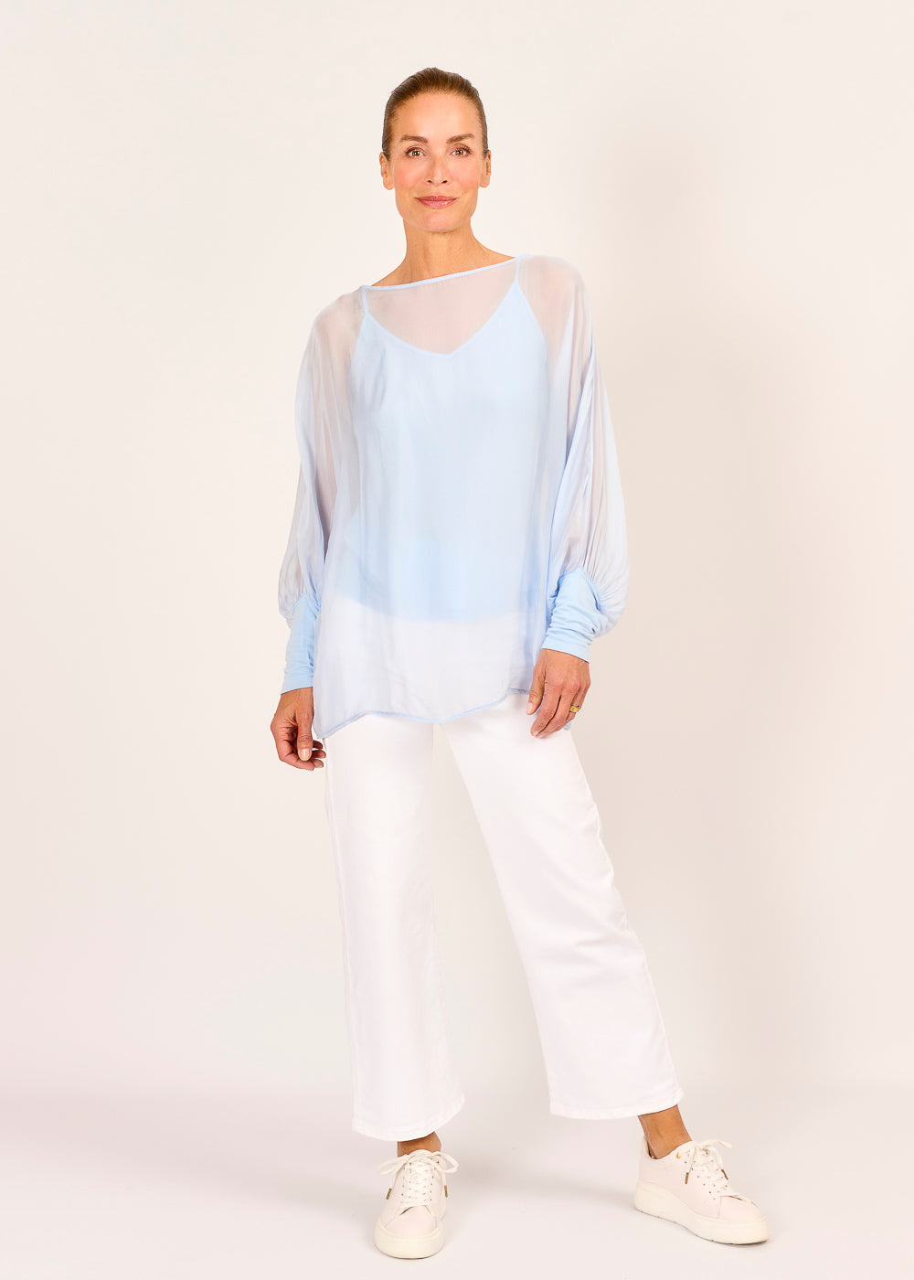 Dieses 2in1 Blusenshirt in der Farbe Celeste kombiniert ein schlichtes Tanktop mit einem transparenten, langärmligen Oberteil für einen spannenden Layering-Look. Elegant und gleichzeitig provokativ – ein stylisches Statement für modebewusste Auftritte.
